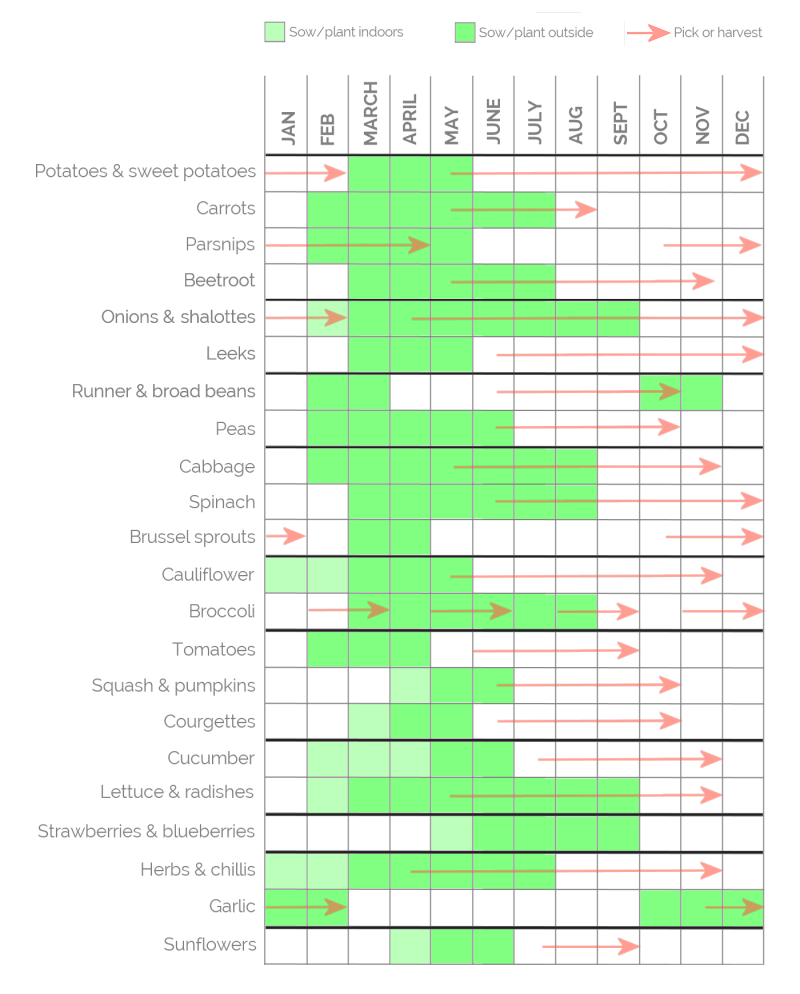 Whilst most vegetables are sown in the spring months, they can be planted in stages to ensure an extended supply and, if you're propogating indoors (on a windowsill or unheated greenhouse, for example) planting out can be delayed still further.